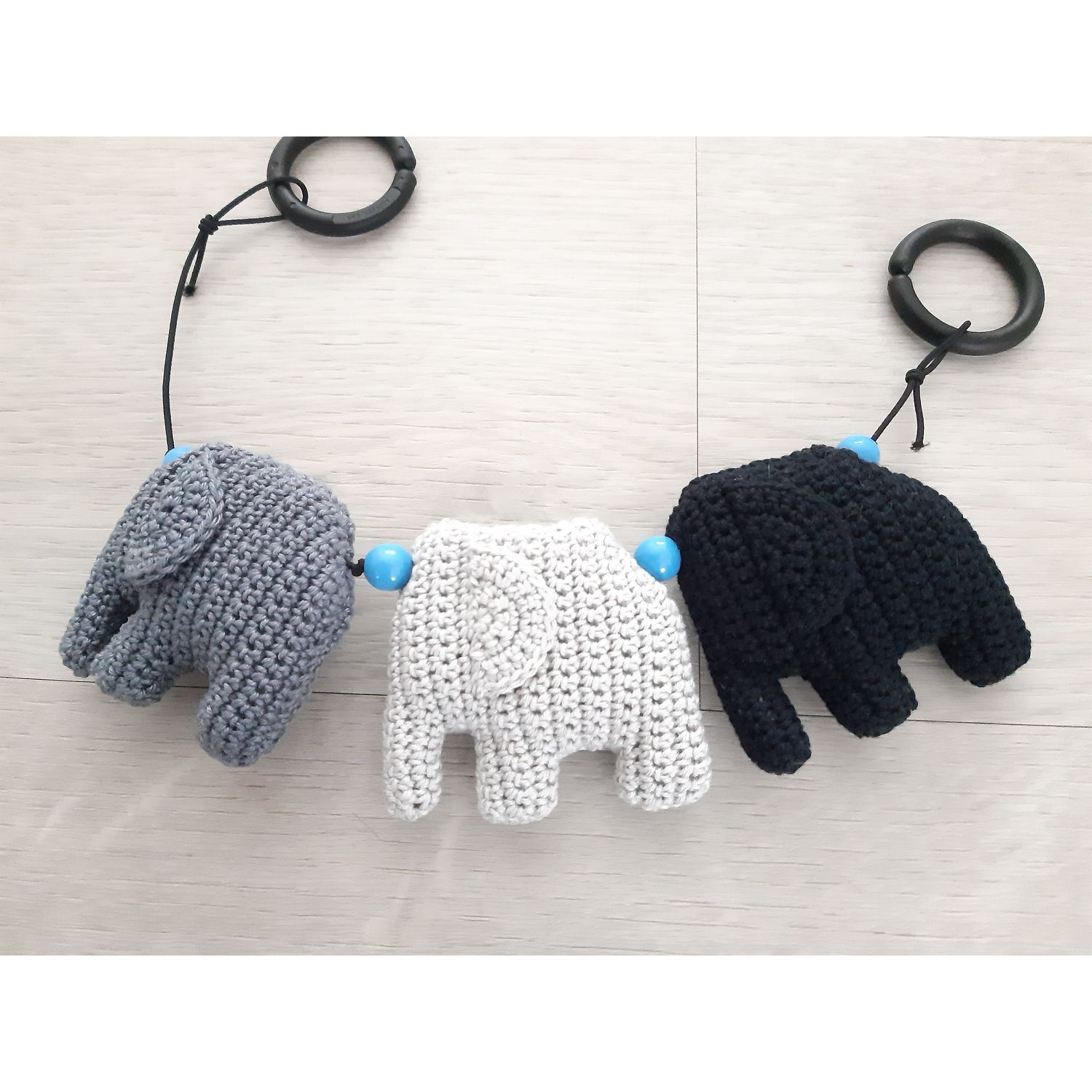 Elefantti vaunukoriste 3 norsua. Yhden norsun koko n.9 cm x 8 cm. Virkattu puuvillalangasta, vanutäyte. Puuhelmet, pyöreä kuminauha ja kiinnitysrenkaat.
