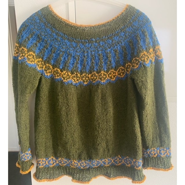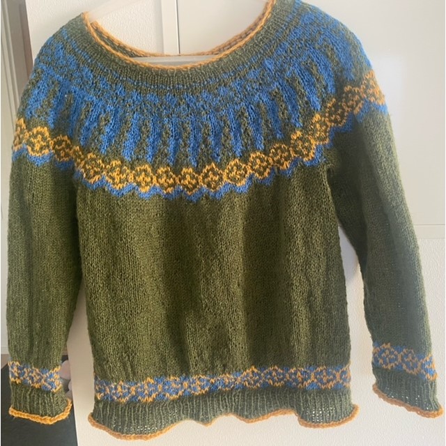 Neuleen kokonaispituus noin 54 cm, kainalo-helma -pituus noin 37 cm, hihan pituus kainalosaumasta resorin loppuun noin 37 cm.