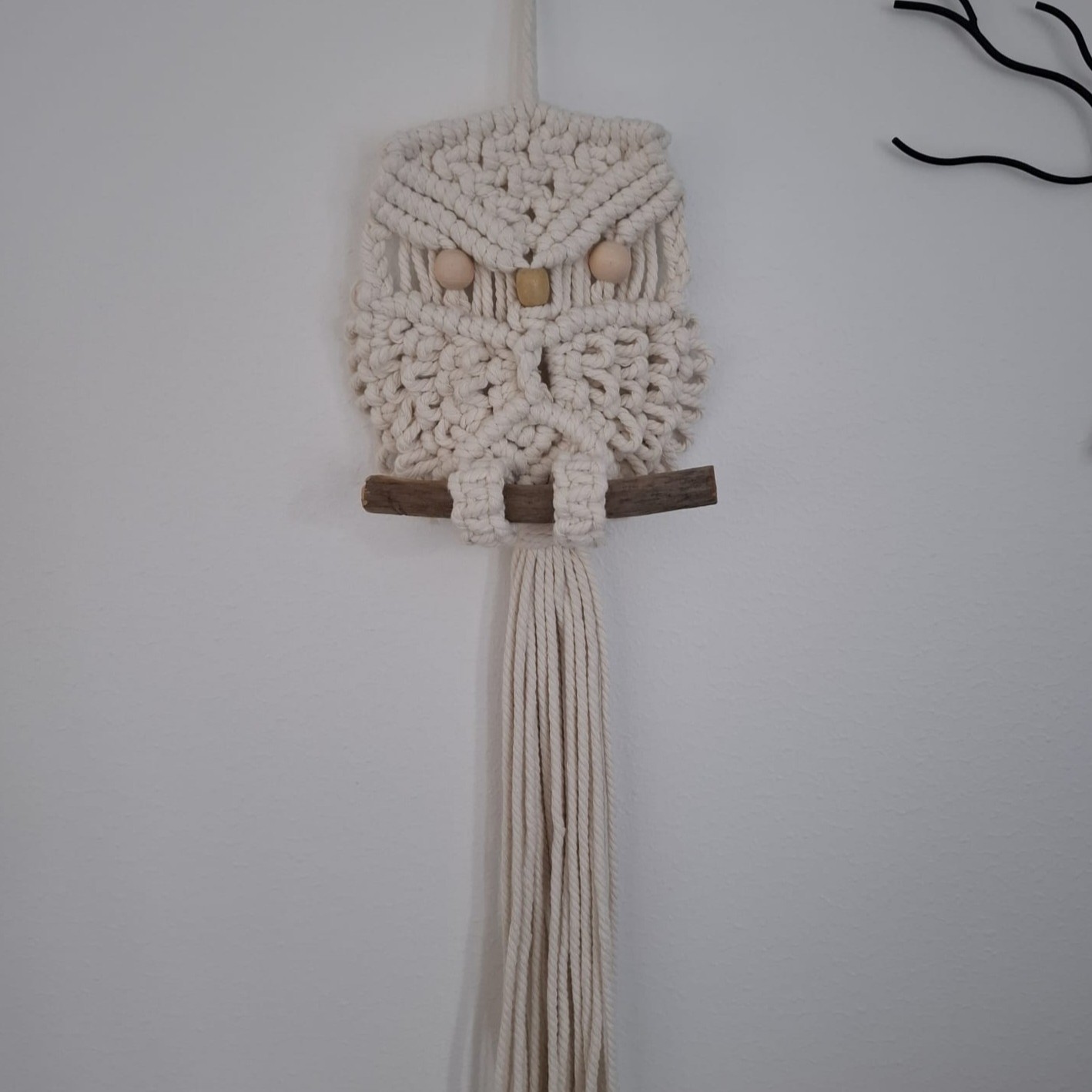 Makrameetekniikalla solmittu pöllö kierrätyspuuvillaisesta punoskuteesta. Lankan paksuus 5 mm.