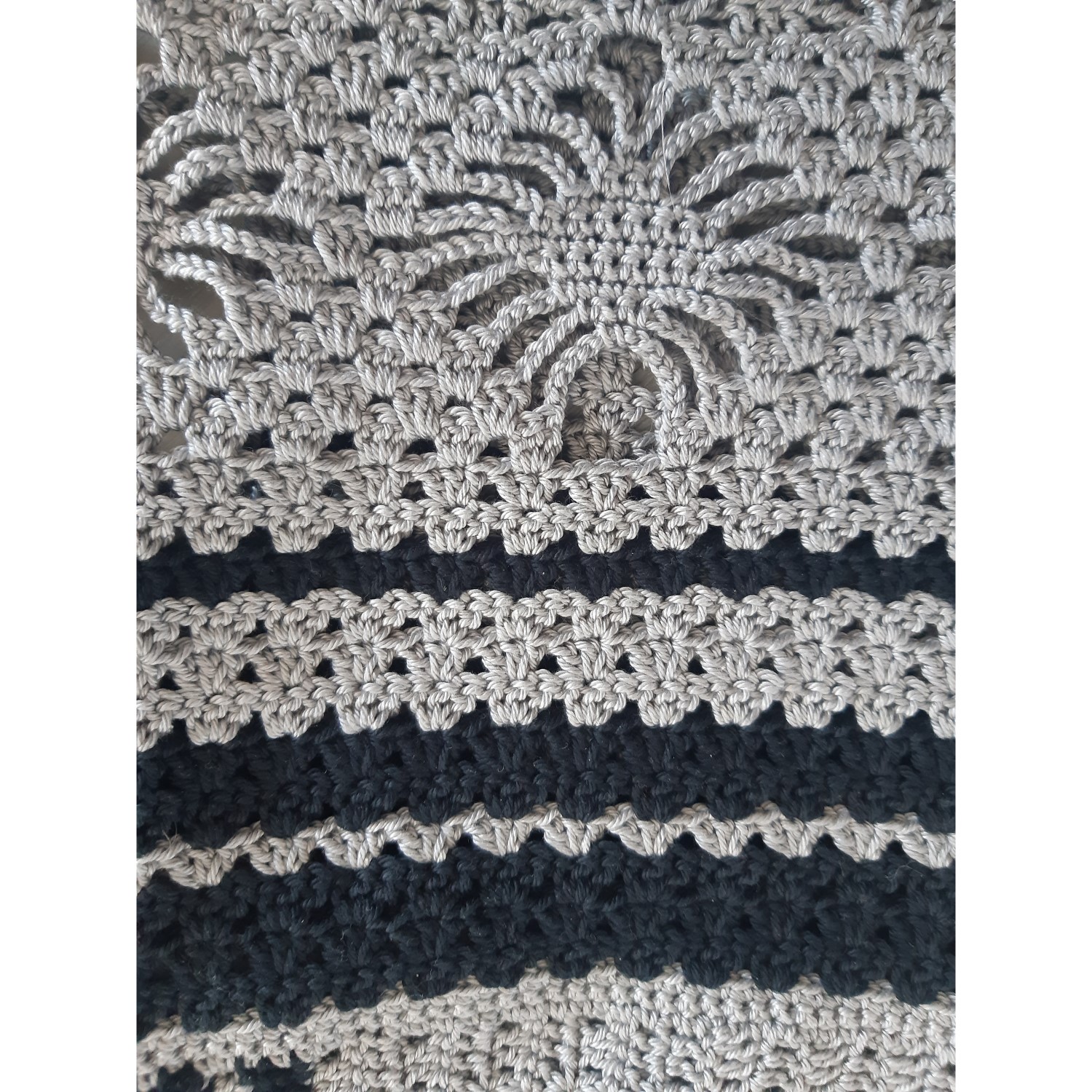 Käsinvirkattu harmaa/musta pitsitoppi jossa kiinnitys niskan taakse ja takana nyöritys. 100 % puuvillaa. Koko S/M. Leveys n.37 cm ja korkeus n.34 cm.