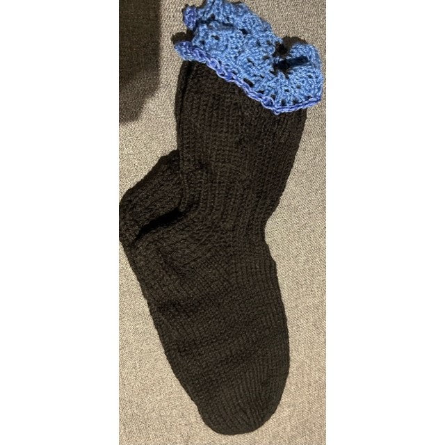 Mustat saapassukat sinisellä pitsikoristeella. Materiaali: 7-veljestä sukkalankasekoite.