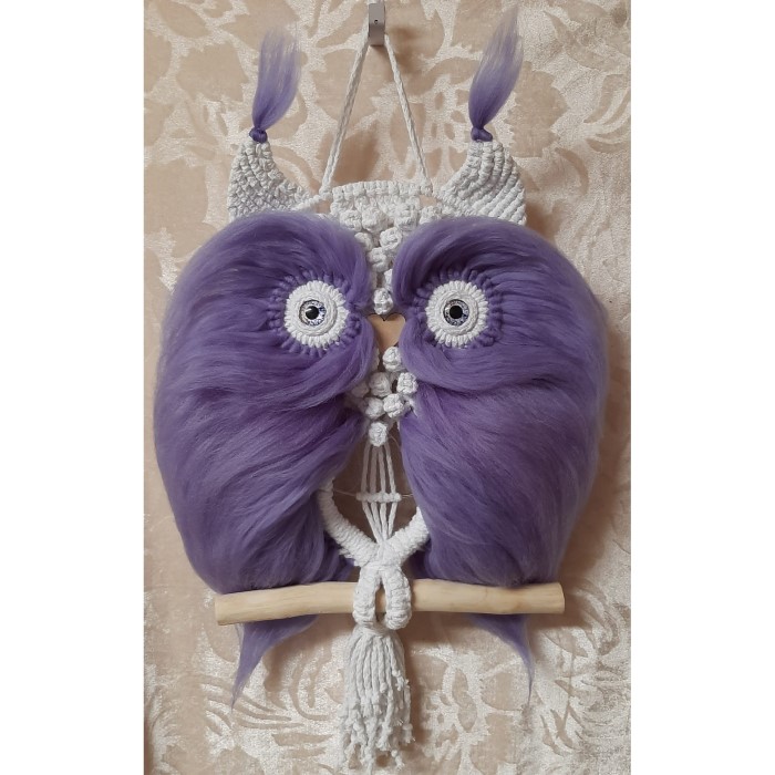Pöllö makramea ja merinovillaa. Näyttävä seinäkoriste. Korkeus 62 cm ja leveys 34 cm. Uniikki kappale.