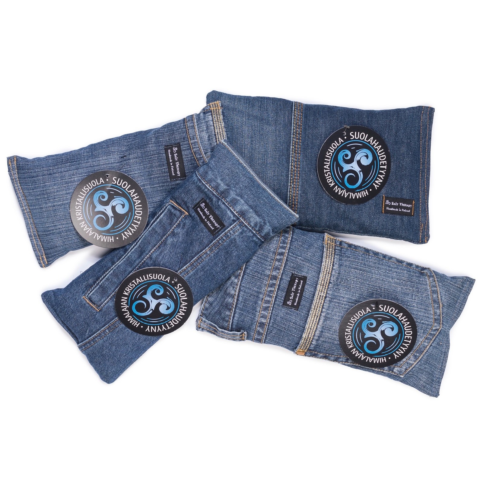 Suolahaudetyynyn kierrätysfarkuista valmistetut päälliset on ommeltu Suomessa, sisältö on aitoa Himalajan kristallisuolaa. Käytä kaurahaudetyynyn tapaan kipeytyneille ja särkeville lihaksille.