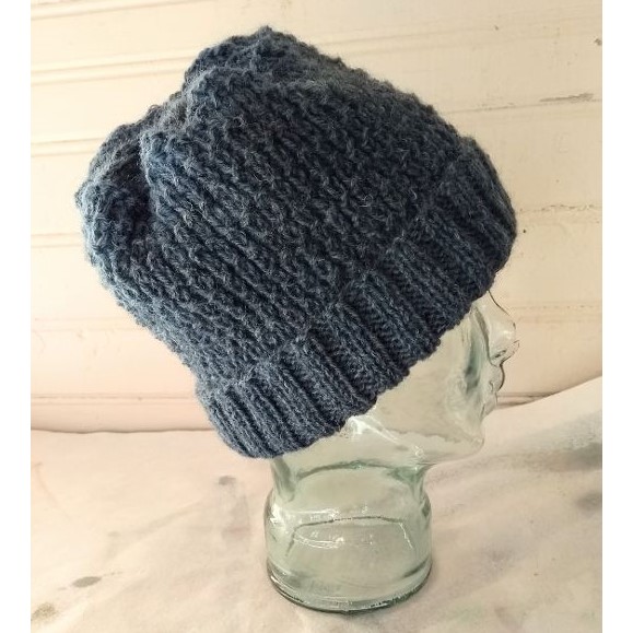 Suomen lampaan villasta neulottu tummansininen kohokuvioneuleinen pipo resorireunalla. Käsinpesu, aikuisten koko.