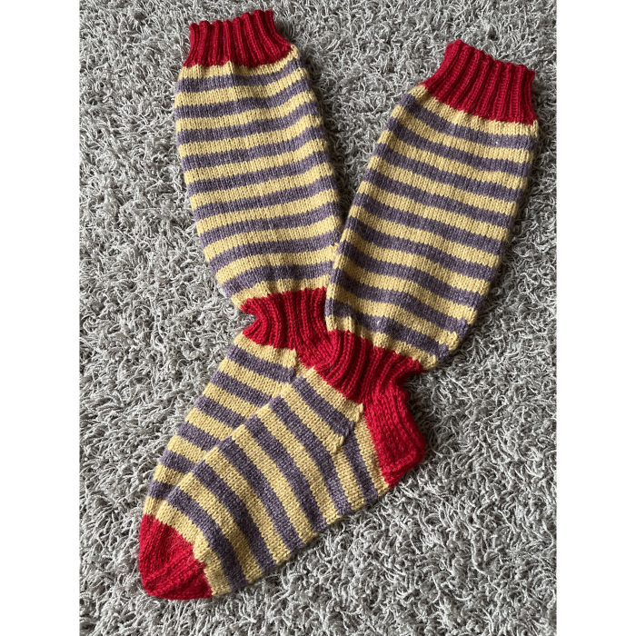 Pitkät raidalliset villasukat vahvistetulla kantapäällä.