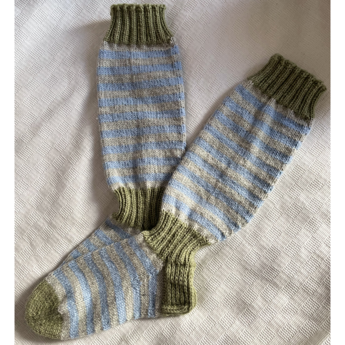 Pitkät raidalliset villasukat vahvistetulla kantapäällä.