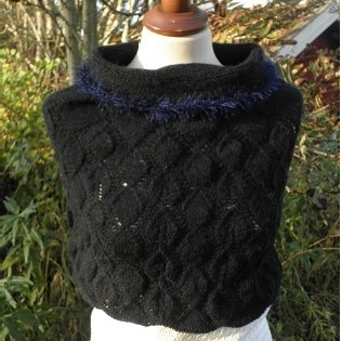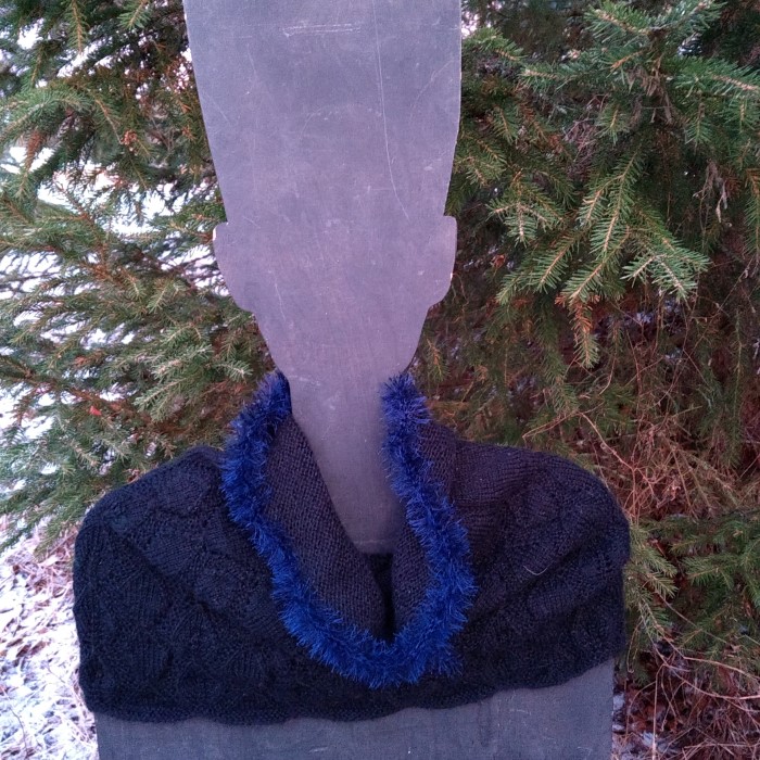 Mustalla Sisu-langalla neulottu Keeppi tai Kauluri.Langan koostumus 80 % villaa , 20 % polyamidia. Kauluksen reunaa koristava sininen hapsulanka aina oikein- neule, hartiaosa pitsineuleena. Levenee alaspäin, helma 100 cm, joustaa 120 cm:iin asti. Koko pituus 44 cm.