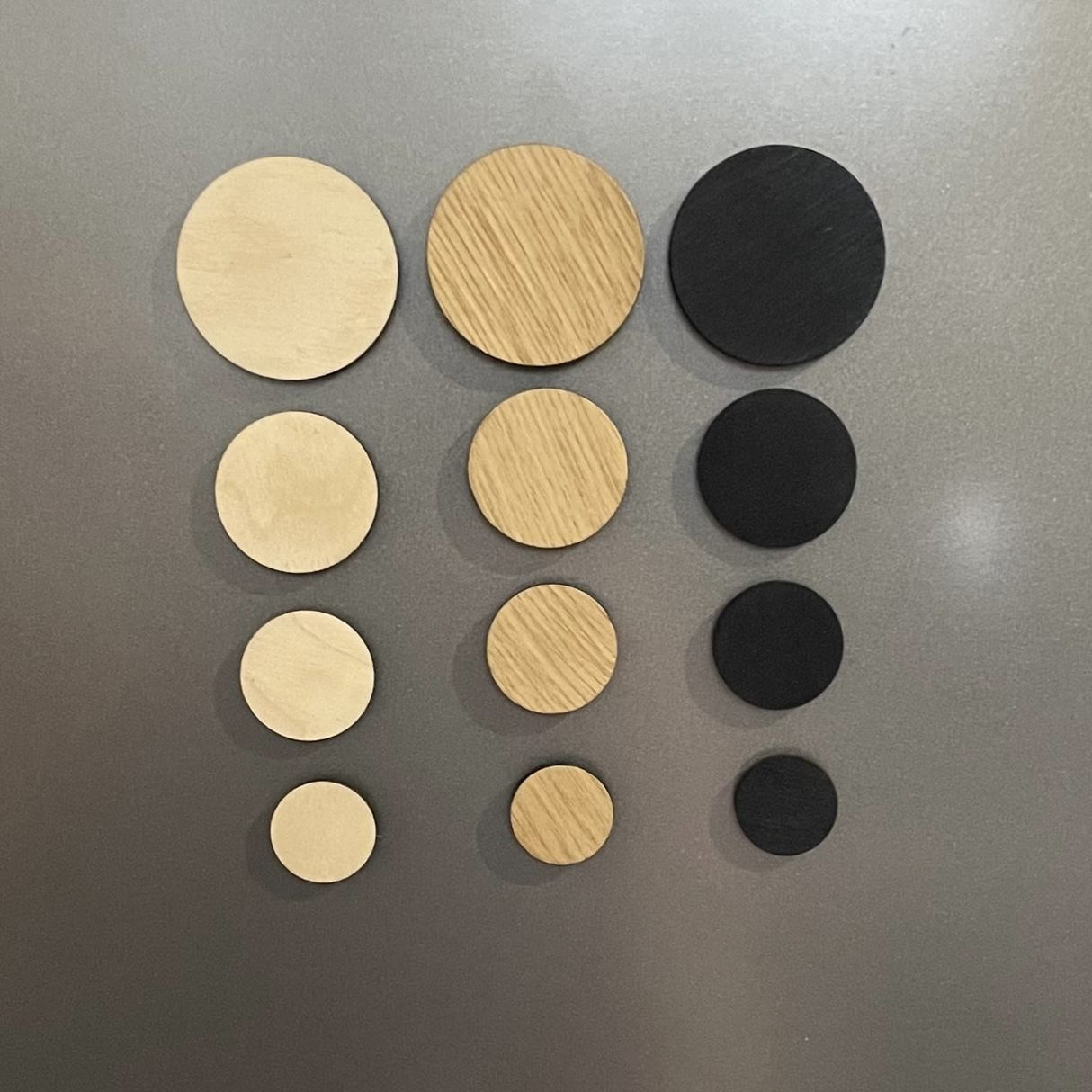 Nämä kauniit ja käytännölliset magneetit on valmistettu kotimaisesta koivuvanerista ja ne sopivat täydellisesti piristämään jääkaappia, ilmoitustaulua tai magneettitaulua. Magneetit ovat saatavana settinä joka sisältää neljää eri kokoa (4 cm, 3 cm, 2,5 cm ja 2 cm) ja kolmessa eri värissä (musta, koivu ja tammi), joten löydät varmasti tarpeisiisi sopivan setin.