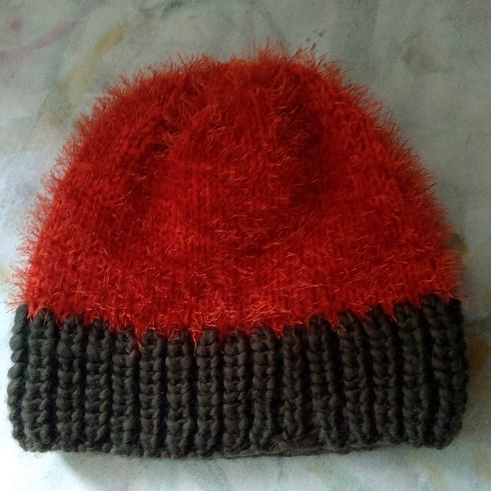 Lakiosa oranssia villalankaa ja hapsulankaa koristeellisesti, hahtuvalankainen villareunus, reilun kokoinen, ympärys 60 cm. lakiosan korkeus 20 cm. Hellävarainen pesusuositus