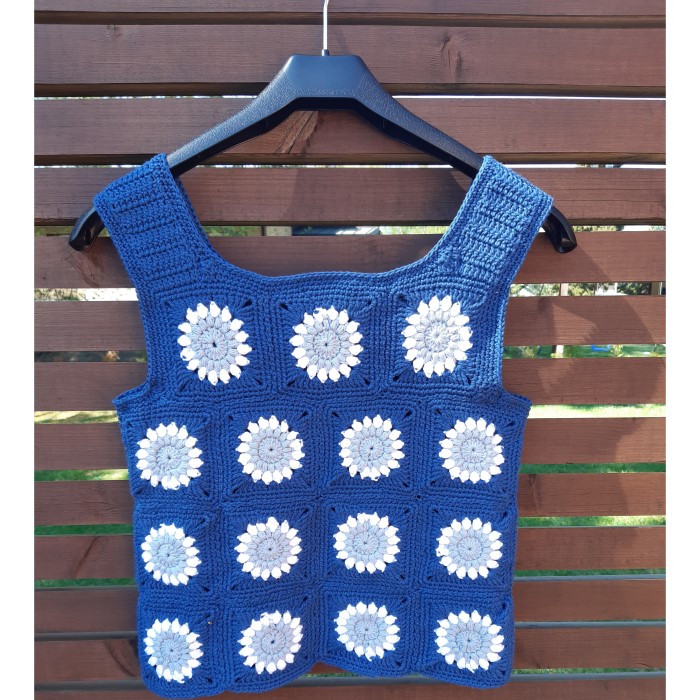 Suloinen puuvillalangasta virkattu toppi. Vartalonympärys 76 cm ja pituus 48 cm. Koko S.
