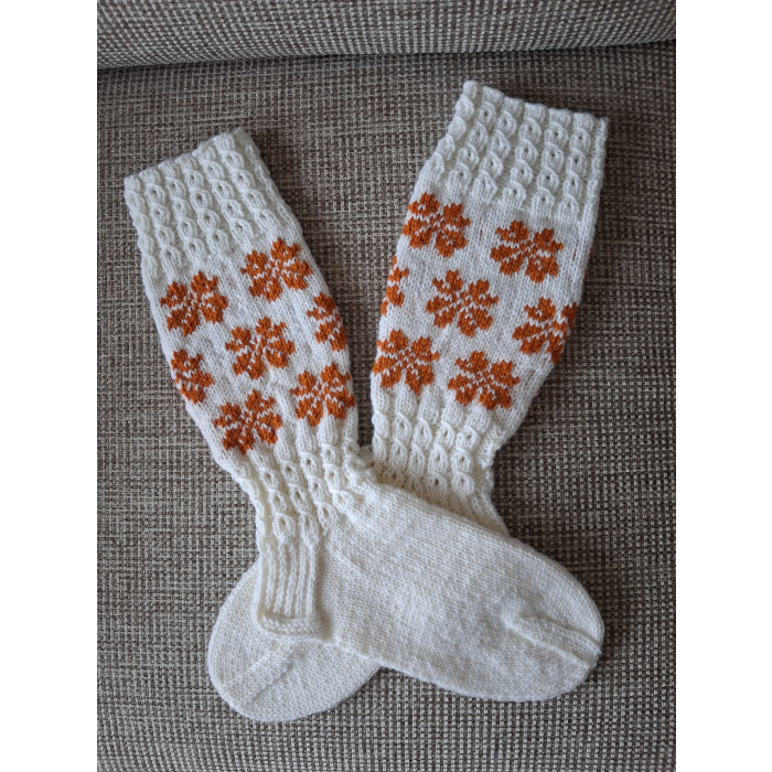 Kukka-aiheiset villasukat. Koko 38-39. Varren pituus kantapään alta n.35cm. 7-velj lankaa,
